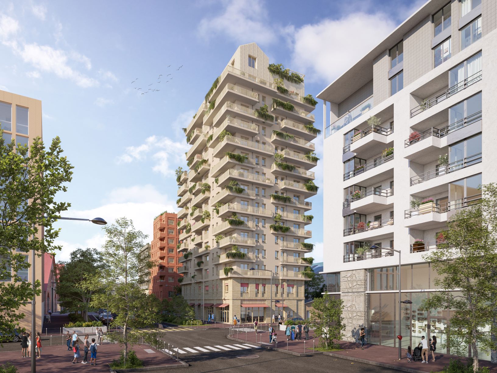 Situé au carrefour de la rue Proudhon et de la rue des Céréales, TIME vient parachever la métamorphose urbaine du quartier Front Populaire. Les 32 logements BRS sont répartis sur cinq niveaux au sein de bâtiments accueillant en rez-de-chaussée un centre médical semble à une maison. Sur l’un des bâtiments, aux deux premiers niveaux en plaquettes de briques et pierre collée succèdent des façades habillées de bois (structure et bardage), faisant écho au cœur d’îlot densément végétalisé. Sur l’autre bâtiment, des plaquettes de brique de teinte rouge seront déployées sur toute la façade et apporteront une touche chaleureuse supplémentaire. HARMONIE ENTRE NATURE ET ARCHITECTURE À compter du 7e étage, le projet livre à ses résidents la faveur de vues en balcon sur Paris et sur le Sacré-Cœur en toile de fond. L’œil est aussi naturellement attiré par le dernier étage semblable à un jardin suspendu. Celui-ci offre son intimité à une terrasse privative, ainsi qu’à une terrasse partagée toutes les 2 très bien exposées et livrant de belles perspectives. Donnant l’impulsion à la ville exemplaire de demain, cette réalisation porte des ambitions environnementales élevées. S’inscrivant dans une démarche vertueuse et écologique d’utilisation de la matière, TIME valorise l’économie circulaire et le réemploi : parcours piéton en bois côté jardin, terre végétale, dallage, mobilier urbain…